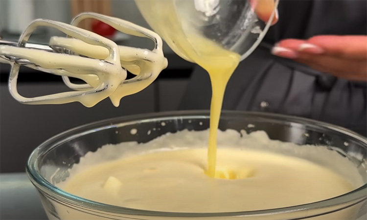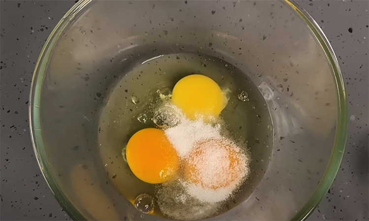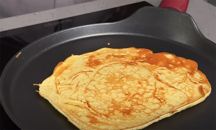 В миске соедините яйца, сахар, соль и ванильный сахар. Взбейте венчиком до пышной светлой массы, около пяти минут. Добавьте мягкое сливочное масло и молоко, перемешайте до однородности. Всыпьте просеянную муку и размешайте, чтобы не осталось комков. Тесто должно быть тягучим, но не густым, легко стекать с ложки. Разогрейте сковороду на среднем огне и не смазывайте её маслом.