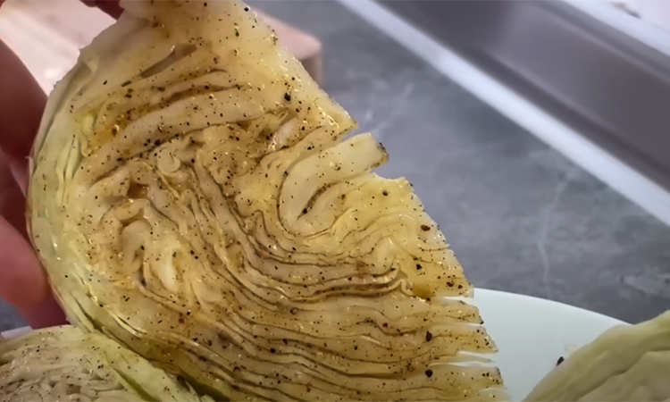 Небольшой кочан капусты промойте, снимите верхние листья и разрежьте пополам. Каждую половинку нарежьте на крупные дольки толщиной около 3–4 см. Следите, чтобы на каждой оставалась часть кочерыжки — она удержит листья вместе во время жарки. В небольшой миске соедините соль, перец, при желании немного паприки и растительное масло.