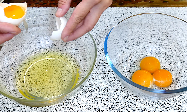 1. Отделите белки от желтков. Используйте чистую, сухую миску для белков — жир мешает взбиванию. Желтки переложите в отдельную миску среднего размера. Духовку разогрейте до 170 °C. Форму для выпечки (диаметром 20–22 см) застелите пергаментной бумагой, чтобы торт не прилип.