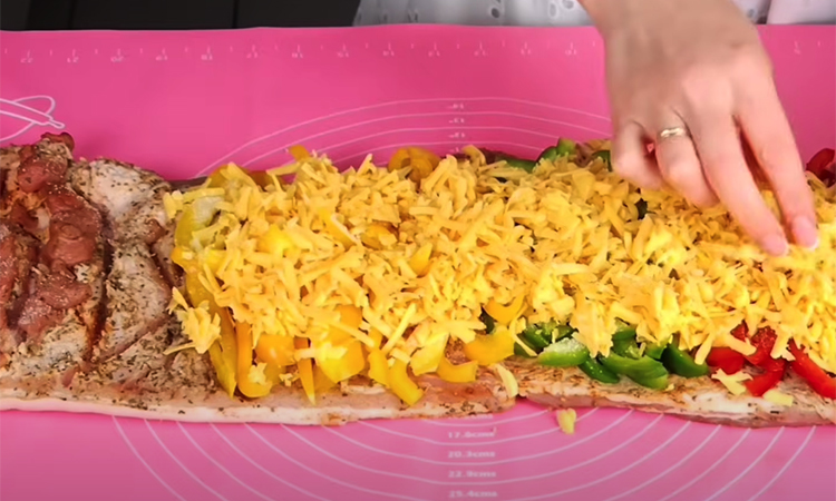 Теперь по всей длине мяса распределите нарезанные мелкими кубиками овощи. Сверните грудинку в рулет и обвяжите кулинарной нитью, чтобы сохранить форму. Оставьте при комнатной температуре на час для маринования.