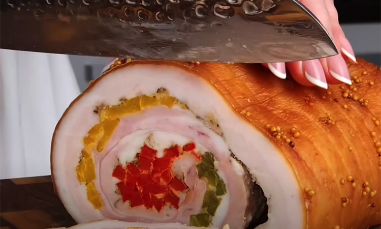 В духовке свинина раскрывается намного лучше, чем на сковороде. Но одним куском запекать ее все же не стоит, намного вкуснее будет превратить ее в сочный и аппетитный рулет. При запекании под фольгой мясо не теряет сок, специи раскрываются, образуя аппетитную золотистую корочку. Рулет получается мягким, пропитанным соком и пряностями, с насыщенным ароматом чеснока и копченой паприки, внутри же дегустатора ждет еще и особенная начинка из пропитанных соком овощей.