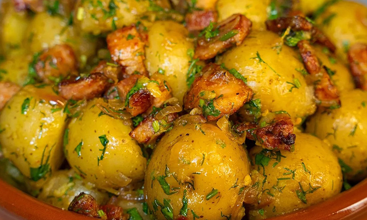 Картофельный салат по-немецки и в классическом варианте получается вкусным. В Грузии этот рецепт сумели довести до идеала, изменив пару важных деталей. В новом варианте бекон обжаривается до румяной корочки, лук карамелизуется, а нежный беби-картофель впитывает ароматную заправку с уксусом и бульоном. Вкус получается глубоким, насыщенным, с легкой кислинкой и ароматом зелени — то, что нужно для уютного домашнего ужина.