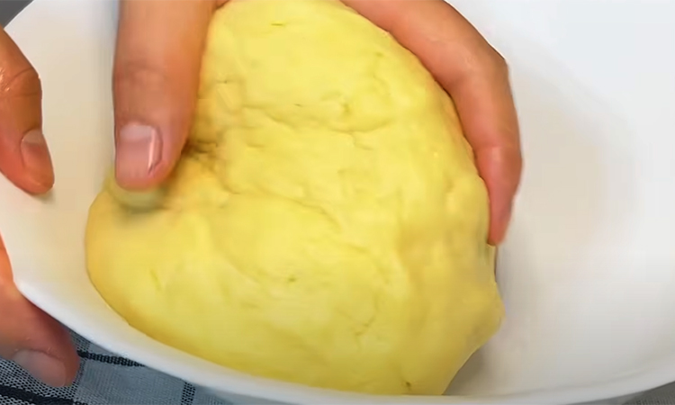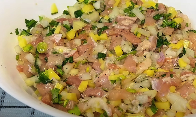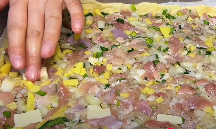 Куриное филе нарежьте кусочками. Лук порежьте полукольцами, посолите, поперчите и слегка помните руками, затем смешайте с курицей. Пока начинка настаивается, займитесь тестом. В миске соедините муку с солью, натрите замороженное масло и быстро перемешайте, чтобы масло не растаяло. Добавьте холодную воду с уксусом и соберите тесто в ком, не вымешивая.
