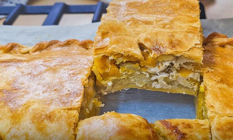 Пирог с курицей и тыквой получается нежным, рассыпчатым и ароматным. Хрустящее тесто, приготовленное без дрожжей, пропитывается соками начинки и не теряет слоистости. Тыква придает блюду мягкий сладковатый оттенок, а лук делает его особенно сочным. Такое сочетание продуктов даёт сбалансированный вкус, которому уступит даже курник.