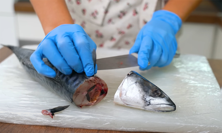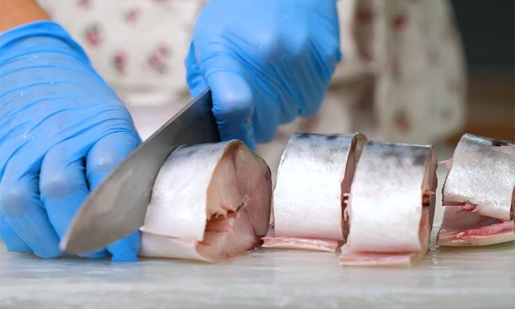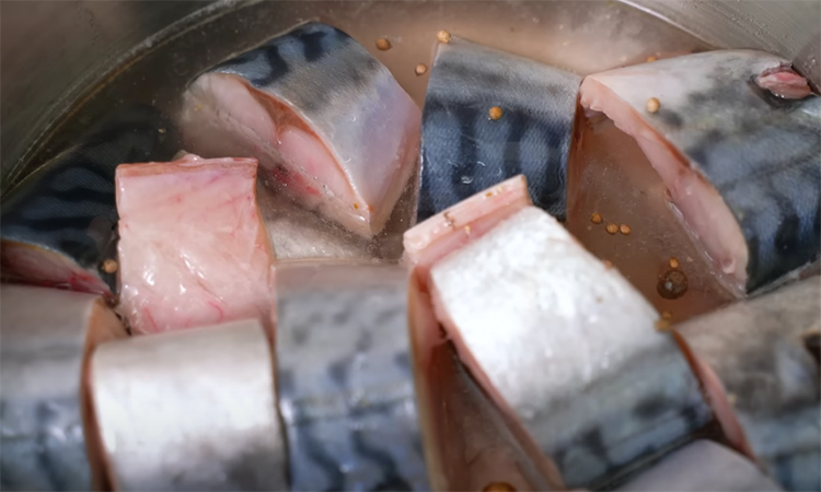 Разморозьте скумбрию, удалите голову, плавники и внутренности. Аккуратно очистите брюшко, удалив чёрную плёнку, тщательно промойте рыбу изнутри и снаружи. Нарежьте тушку на порционные куски и уложите в кастрюлю с толстым дном. В отдельной миске смешайте воду, соль и сахар, добавьте растительное масло, душистый и чёрный перец, лавровый лист и кориандр.