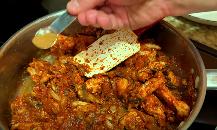 Жарьте их 3–4 минуты, пока они не уменьшатся в объёме и не станут ароматными, добавьте измельчённый чеснок и прогрейте ещё 30 секунд. Добавьте томатную пасту и сладкую паприку, тщательно перемешайте и прогрейте пару минут, чтобы паста раскрыла вкус. Верните курицу в сковороду, добавьте муку, тщательно размешайте, чтобы не образовались комки, и постепенно влейте горячую воду или бульон.