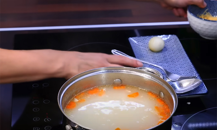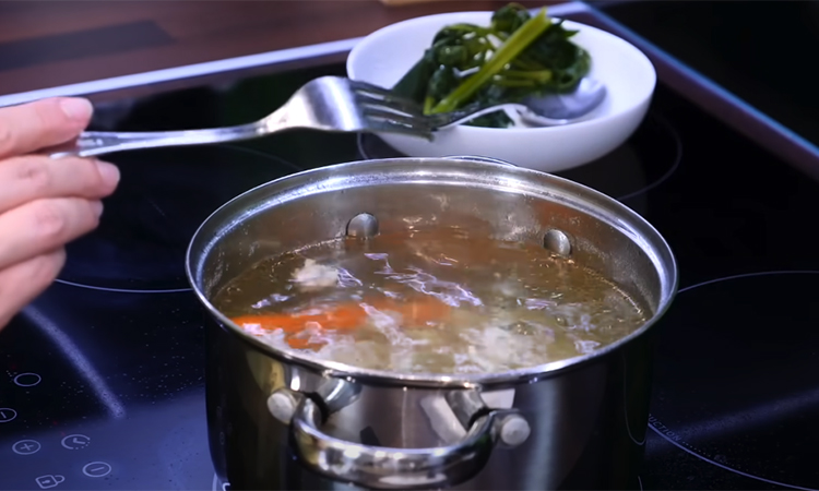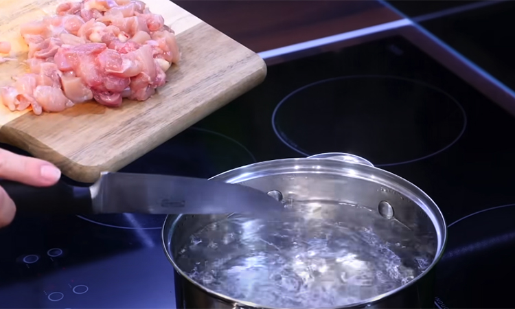 Мясо нарежьте небольшими кусочками. Вскипятите воду и отправьте в неё мясо, чтобы продукты сохраняли максимум вкуса. Немного уменьшите огонь и уберите пену, которая появляется на поверхности. Пока курица варится, подготовьте морковь, лук и зелень: морковь порежьте пополам, лук добавьте целиком, зелень отправьте в бульон для аромата.