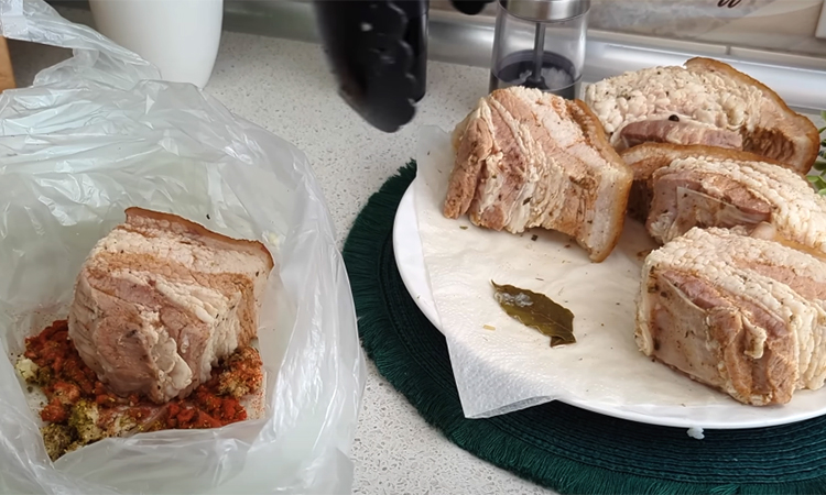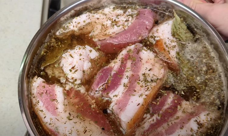 Если хочется вкусного бекона, но нет времени или желания коптить и жарить долго, этот рецепт — настоящая находка. Свинина варится в ароматном рассоле всего 5–6 минут, а затем просаливается и обогащается специями, чтобы вкус был насыщенным и дымным. За один день можно получить идеальный вариант для бутербродов, салатов и гарниров — нежный, сочный и ароматный.