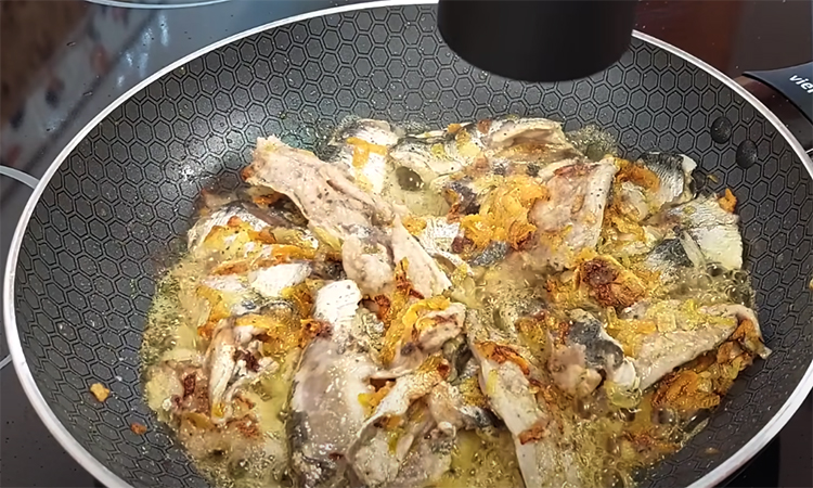 Измельчите лук и чеснок, обжарьте на растительном масле с щепоткой соли и сахара до мягкости. Добавьте натертую морковь и готовьте ещё 3–4 минуты до лёгкой карамелизации. Отделите филе ставридки от хребта и добавьте к овощам, обжарьте 3–4 минуты с каждой стороны.