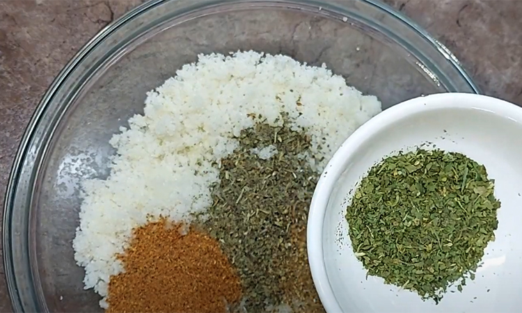 Возьмите крупную соль, при необходимости разломайте комочки вилкой. Чеснок пропустите через пресс или натрите на мелкой тёрке. В миске тщательно смешайте соль с чесноком и всеми специями: кориандром, паприкой, острым перцем, чёрным перцем и орегано. Перемешивайте, пока не исчезнут все комочки чеснока и смесь не станет однородной.