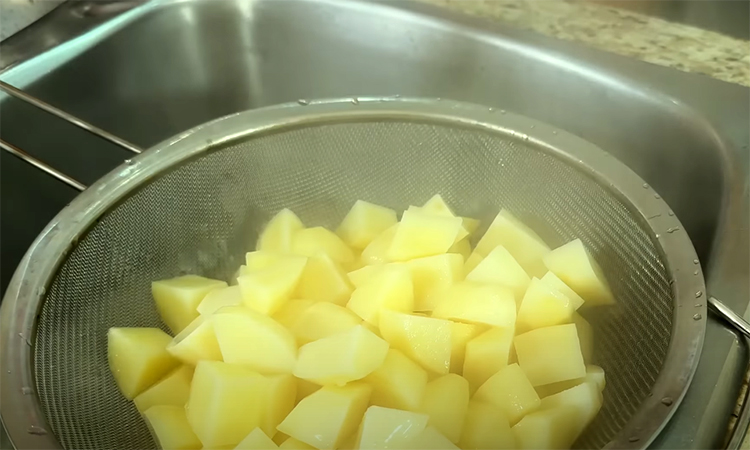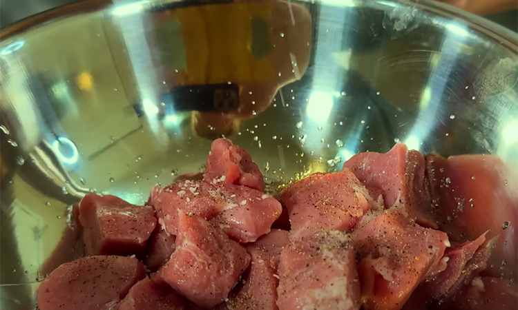 Мясо очистите от плёнок и нарежьте средними кусками. В миске соедините мясо с натёртым луком, солью, перцем и хмели-сунели. Перемешайте и оставьте на 20–30 минут, чтобы свинина пропиталась ароматами специй и стала нежной. За это время очистите картошку, нарежьте кубиками и залейте холодной водой, чтобы избавиться от лишнего крахмала. Затем опустите картофель в кипящую подсоленную воду на 3 минуты, откиньте на дуршлаг и дайте обсохнуть.