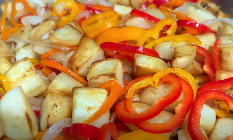 На горячей сковороде с каплей масла обжарьте мясо до золотистой корочки, буквально по 1,5 минуты с каждой стороны. Снимите и временно отложите. В той же сковороде жарьте картошку на сильном огне, не трогая первые минуты — чтобы появилась румяная корочка. Когда картошка подрумянится, добавьте лук, затем сладкий перец и немного соли.