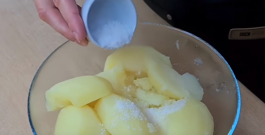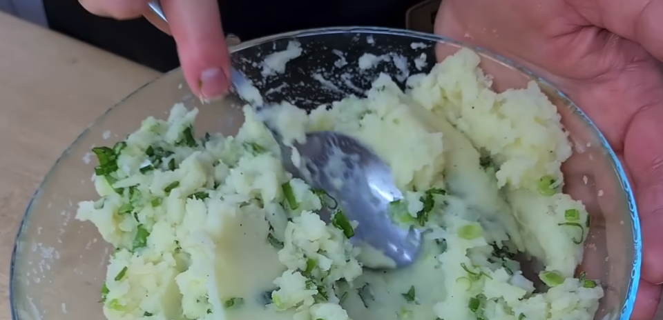 Сначала приготовьте начинку. Картофель сварите без соли — так он не впитает лишнюю воду. Когда станет мягким, разомните и добавьте масло, соль, перец, затем мелко нарезанный зелёный лук. В чуть остывшее пюре вмешайте натёртый сыр — он сделает начинку тягучей и ароматной. Пусть полностью остынет. Для теста соедините кефир, сметану, яйцо, соль, сахар, соду и растительное масло.