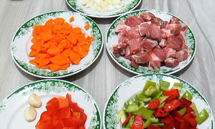 2. Мясо нарежьте небольшими кубиками или тонкими полосками (чем мельче, тем быстрее приготовится). Морковь нарежьте тонкими полукругами или небольшими кубиками, чтобы она хорошо прожарилась и не была слишком жесткой. Лук нарежьте мелкими кубиками, чтобы он равномерно обжарился и стал прозрачным. Сладкий перец нарежьте крупными кубиками — он даст сочность и сладкий аромат. Чеснок измельчите ножом или через пресс, чтобы аромат равномерно распределился. По желанию можно подготовить дополнительные специи: паприку, сушеный тимьян или немного молотого мускатного ореха — они прекрасно сочетаются с тыквой.