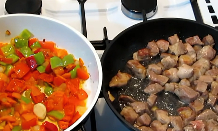 3. На сковороде разогрейте 2–3 столовые ложки растительного масла. Добавьте мясо и обжаривайте на среднем огне до появления легкой золотистой корочки и полуготовности (около 5–7 минут).