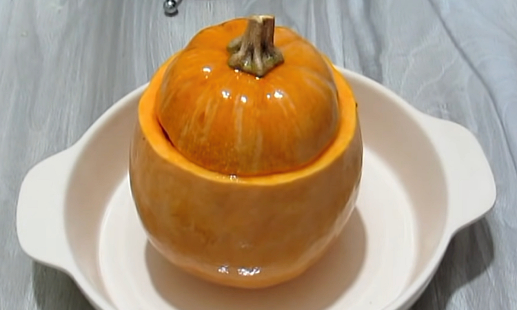 5. Наполните тыкву подготовленной смесью, слегка утрамбовывая, чтобы она полностью заполнила «горшочек». Сверху полейте небольшим количеством растительного масла — это поможет сохранить сочность. Если начинка суховата, можно добавить 2–3 столовые ложки горячей воды, но старайтесь не разбавлять сок слишком сильно. Накройте тыкву «крышечкой» или фольгой.