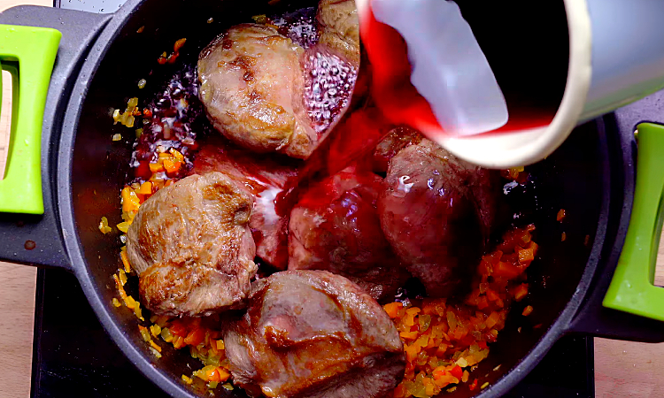 3. Верните мясо в сковороду к овощам. Влейте красное вино и мясной бульон. Количество жидкости должно примерно покрывать мясо на 2/3. Доведите до легкого кипения на сильном огне, затем уменьшите огонь до минимума. Накройте крышкой и тушите 2 часа, периодически проверяя уровень жидкости и при необходимости добавляя немного бульона или воды.