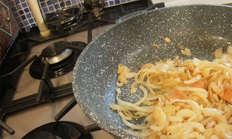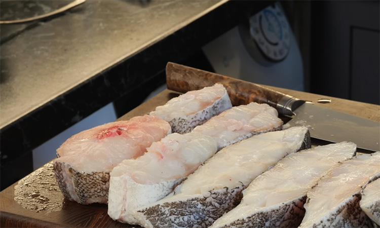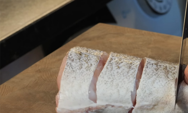 Рыбу нарежьте крупными кусками, посолите, поперчите и обваляйте в муке. Обжарьте на растительном масле до лёгкой корочки, затем переложите в миску. В этой же сковороде обжарьте нарезанный полукольцами лук до мягкости и румяного цвета, добавьте сливочное масло. Всыпьте ложку муки, перемешайте и влейте воду или бульон.