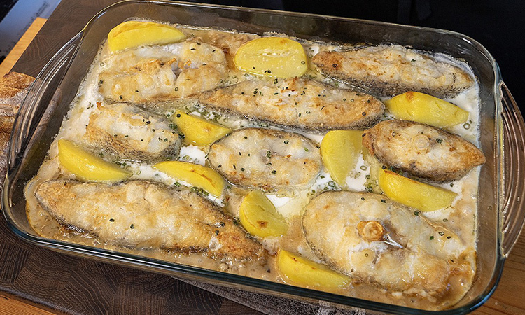 Добавьте сметану, посолите, поперчите — получится густая заливка с нежным сливочным вкусом. Картошку отварите почти до готовности, остудите и нарежьте кружками. В форму для запекания выложите слой лука, сверху рыбу, затем картошку. Посыпьте всё нарезанным укропом, добавьте лавровые листья и залейте сметанным соусом.