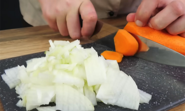 Промойте перловую крупу до прозрачной воды и откиньте на сито, чтобы стекла лишняя жидкость. Пока она подсыхает, очистите и вымойте овощи. Разогрейте сухую сковороду и отправьте туда крупу, прожарьте ее на среднем огне до появления легкого орехового аромата. Дайте крупе остыть, затем залейте водой и оставьте набухать. Нарежьте лук кубиком, морковь крупными брусочками, а помидоры — кусочками чуть больше лука.
