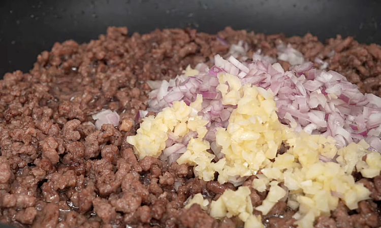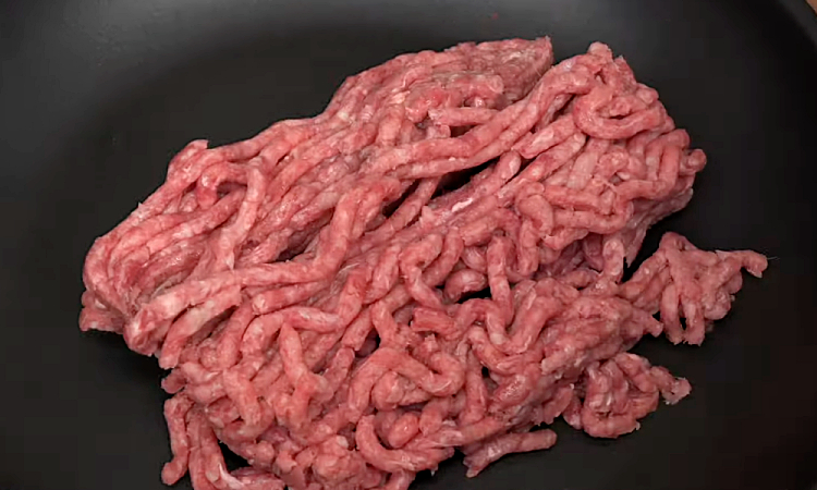 1. Налейте немного растительного масла в сковороду и хорошо ее разогрейте. Выложите фарш и распределите его равномерно по поверхности. Обжаривайте около 2–3 минут на среднем огне, не перемешивая — пусть снизу образуется легкая румяная корочка. Затем аккуратно перемешайте, чтобы мясо прожарилось равномерно. Фарш должен стать рассыпчатым и слегка поджаренным.