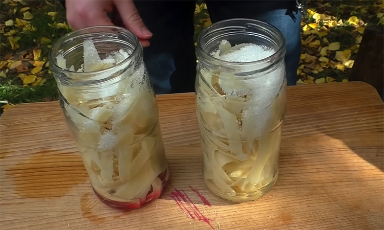 Пока он остывает, подготовьте чистые банки — достаточно просто вымыть, стерилизовать не нужно. На дно можно положить немного нарезанного имбиря для аромата. В одну банку можно добавить несколько ломтиков свеклы — она придаст хрену красивый розовый оттенок, но на вкус почти не повлияет. Заполните банки бланшированным хреном, не утрамбовывая слишком плотно. В каждую добавьте по полчайной ложки соли и столовой ложке сахара.