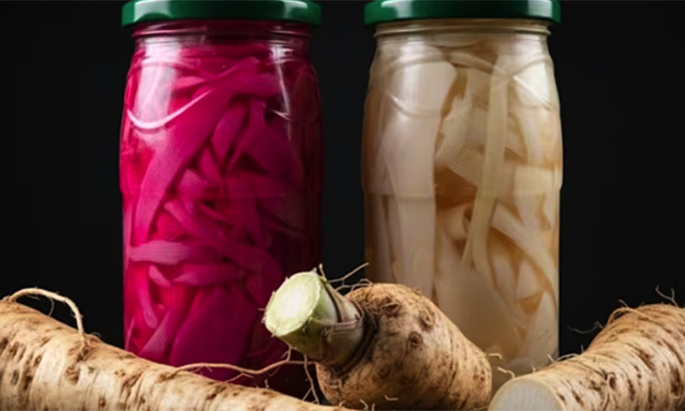 Маринованный хрен прекрасно сочетается с мясом, холодцом, копченостями или просто с черным хлебом. Он хранится несколько месяцев.