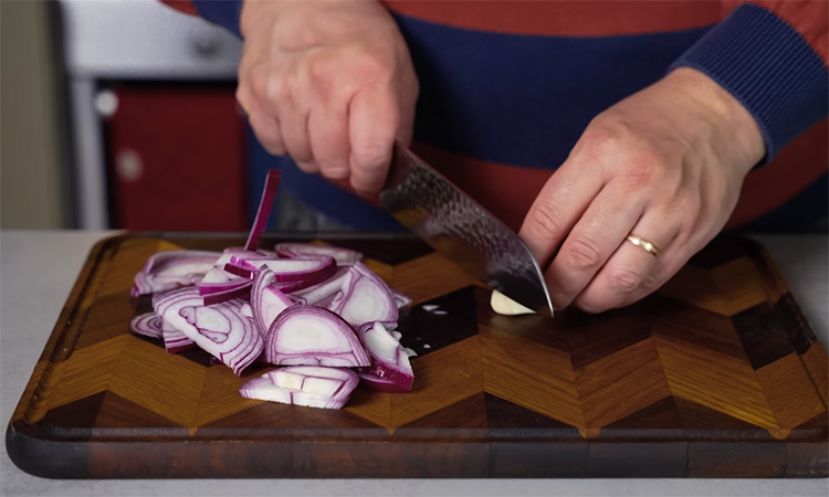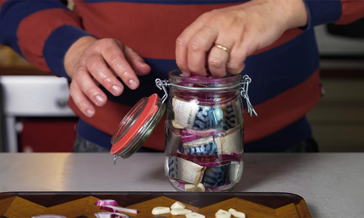 Тем временем подготовьте рыбу: удалите плавники, при желании снимите спинные с помощью пинцета. Нарежьте скумбрию порционными кусками. Лук очистите и нарежьте полукольцами, чеснок — тонкими пластинами. В банку или контейнер выложите первый слой лука, добавьте немного чеснока, затем слой рыбы. Повторяйте, пока не закончите ингредиенты, верхним слоем должен идти лук с чесноком.