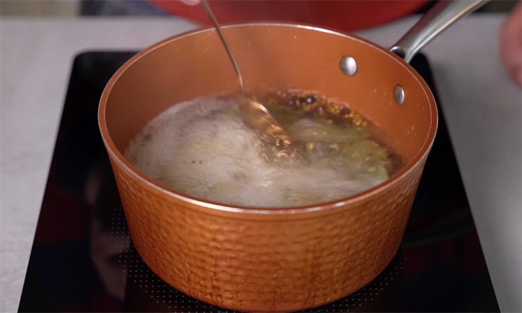 Для начала приготовьте маринад, чтобы он успел остыть. В сотейник налейте литр кипящей воды, добавьте соль, сахар, горчицу, лавровый лист, душистый перец и кориандр. Перемешайте, доведите до кипения и варите 2–3 минуты, чтобы специи раскрыли аромат. Затем влейте уксус, размешайте и уберите с огня, оставьте до полного остывания.