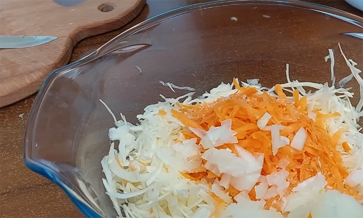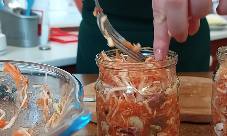 Начните с капусты. Нашинкуйте её тонко, добавьте натертую морковь и мелко нарезанный лук. Посолите, приправьте перцем и сушеным чесноком, перемешайте руками и слегка пожмите, чтобы выделился сок. Влейте томатный сок и добавьте немного томатной пасты. Если хотите, разделите капусту на две части — одну сделайте с грибами, другую с мясом. Грибы нарежьте мелко, мясо — небольшими кусочками. В чистые сухие банки выложите слоями капусту и грибы, уплотняя, а в другие — мясо и капусту. В каждую банку положите по кусочку лаврового листа и немного смальца сверху.