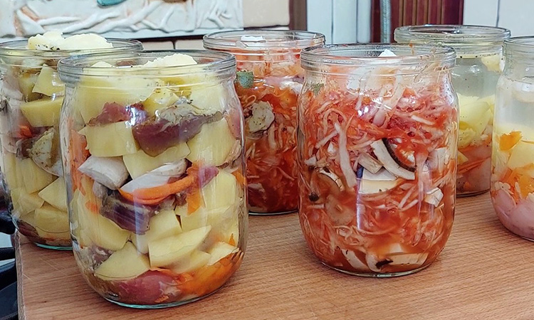 Целое меню для всей семьи легко можно приготовить не пачкая посуду, в обычных банках. Принцип рецептов тут такой же, как и для глиняных горшочков, только в банках все получается еще проще и быстрее. Три блюда готовятся одновременно: делаем и суп, и картофель с мясом, и капусту с грибами на гарнир.