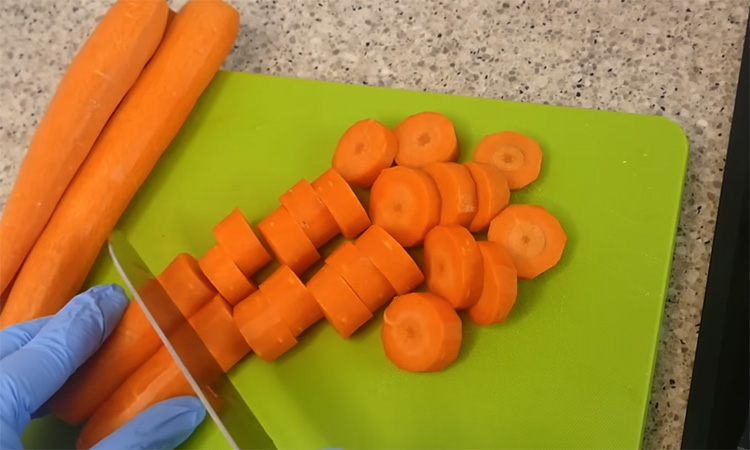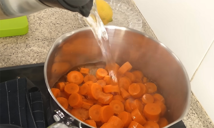 Очистите морковь, нарежьте кружками толщиной около сантиметра и выложите в кастрюлю. Залейте горячей водой, добавьте чайную ложку соли, доведите до кипения и убавьте огонь. Варите под крышкой пятнадцать минут, пока морковь не станет мягкой, но сохраняющей форму. Переложите на сито, чтобы стекла вода. Пока морковь варится, приготовьте соус.