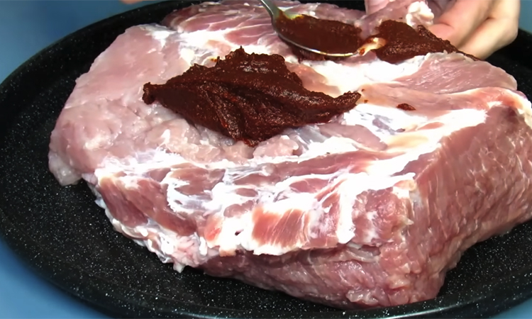 В отдельной миске смешайте паприку, сушеный чеснок, перец, чайную ложку соли и кетчуп. Перемешайте до густой консистенции — получится ароматная паста для маринования. Натрите мясо этой смесью со всех сторон, затем добавьте мед и равномерно распределите его по поверхности. После этого обмажьте мясо французской горчицей, чтобы образовалась плотная пряная глазурь.