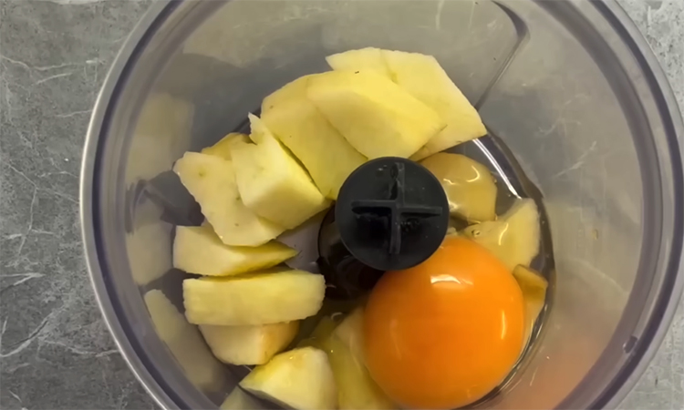 Очистите яблоко и нарежьте небольшими кусочками. В чашу блендера положите яблоко, творог, сметану, яйцо, сахар и корицу. Добавьте ложку кукурузного крахмала, чтобы десерт получился более плотным и держал форму. Если хотите сделать его совсем легким, крахмал можно не использовать — тогда структура будет мягкой, как у суфле.