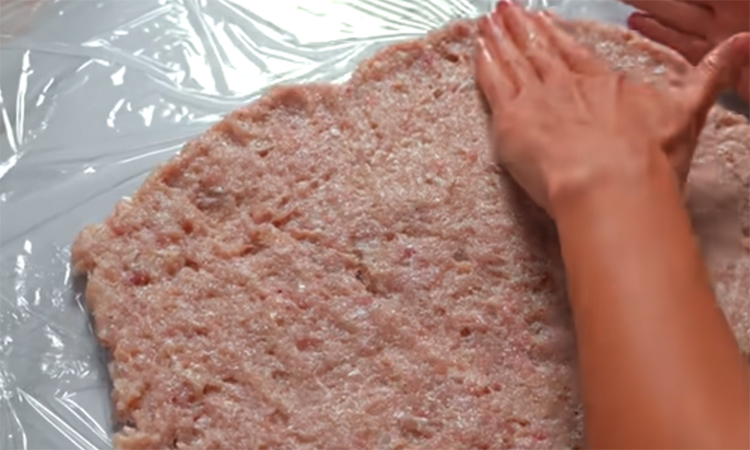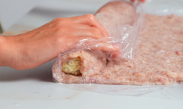 Разомните вилкой до состояния густой пасты. На стол постелите пищевую пленку, выложите фарш и, смочив руки водой, распределите его в форме прямоугольника толщиной около 1,5 см. По центру выложите начинку и аккуратно сверните рулет, помогая себе пленкой. Переложите рулет на противень, застеленный пергаментом.