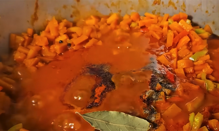 Когда морковь станет мягкой, добавьте томатную пасту, перемешайте и варите под крышкой ещё 15 минут. Затем добавьте нарезанный перец, перец горошком, молотый перец, паприку и лавровый лист. Продолжайте тушить 20 минут.
