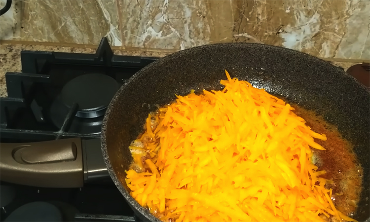 Для начинки натрите тыкву на крупной тёрке. В сковороде растопите сахар до состояния карамели, добавьте сливочное масло и перемешайте до однородности. Выложите тыкву и обжаривайте в карамели 5 минут, чтобы она стала мягкой и впитала аромат. В конце добавьте корицу, перемешайте и оставьте начинку остывать.