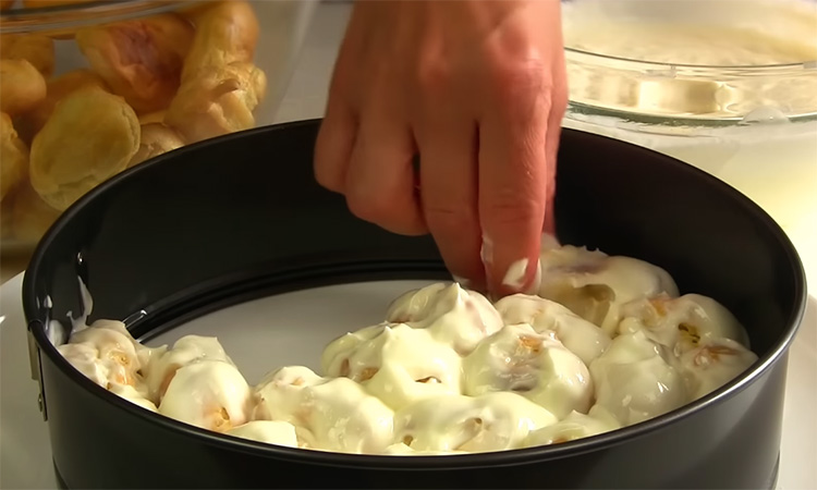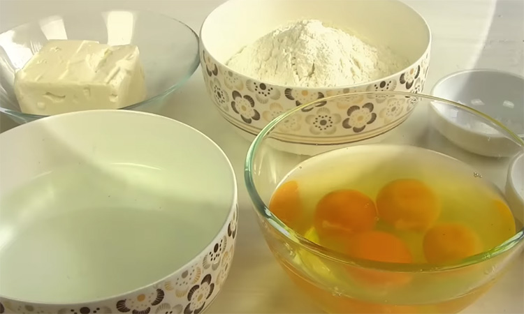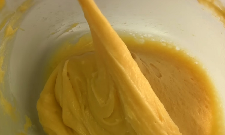 Переложите тесто в миску, остудите до температуры около 40°. Добавляйте яйца по одному, каждый раз тщательно вмешивая. Консистенция должна быть гладкой, тягучей, чтобы тесто стекало с лопатки лентой. Переложите массу в кондитерский мешок, отсадите заготовки длиной 5 см на противень, застеленный бумагой. Выпекайте при 220° 5 минут, затем уменьшите до 190° и держите ещё 30–35 минут до румяного цвета, затем остудите.