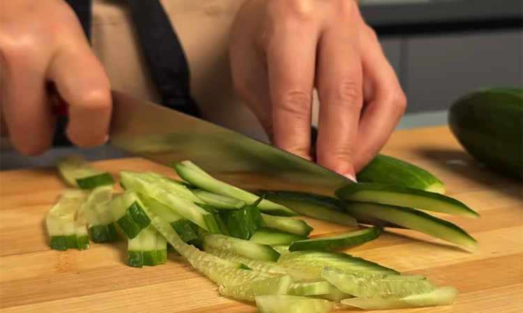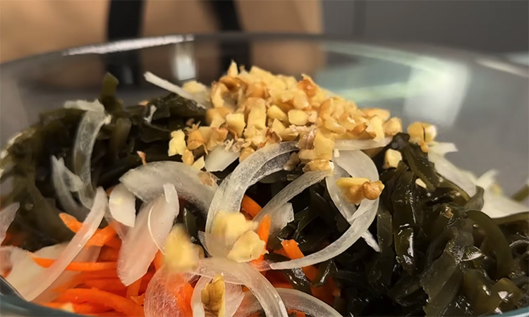Огурцы нарежьте тонкой соломкой и выложите в миску. Морковь натрите на тёрке для корейских овощей. Добавьте морскую капусту, предварительно слив жидкость. Лук нарежьте тонкими перьями, орехи порубите крупно и добавьте всё к овощам.