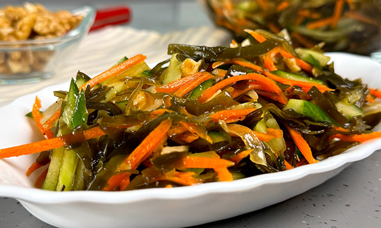 Овощные салаты слишком часто получаются пресными — Сахалинский же приятное и редкое исключение. Здесь все ингредиенты сохраняют текстуру и хрусткость, сочность салату придает вовсе не вредный майонез, а соус на основе соевого в смеси с перцами. Морская капуста делает салат по-настоящему особенным, подается он и отдельной закуской, и гарниром к мясу.