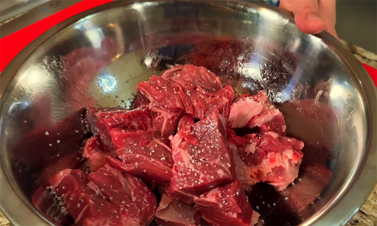 Мясо нарежьте крупными кусками, оставив немного жира — так оно сохранит сочность. Посолите крупной солью, поперчите и оставьте при комнатной температуре, чтобы оно слегка прогрелось перед обжаркой. На широкой сковороде разогрейте растительное масло и обжарьте мясо партиями до румяной корочки, чтобы оно не тушилось в собственном соке.