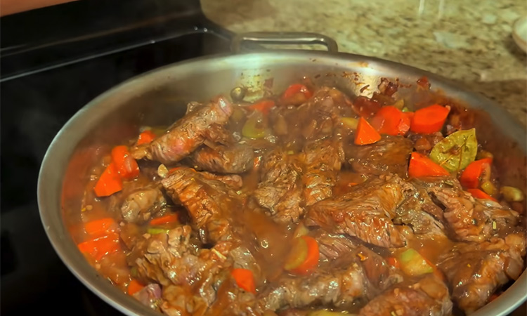 Переложите мясо в миску и слейте лишний жир, оставив на дне сковороды прижаренные кусочки — они станут основой соуса. В ту же сковороду выложите нарезанный лук и немного воды или вина, чтобы собрать со дна все прижарки. Обжаривайте лук до прозрачности, затем добавьте нарезанный чеснок, тимьян, розмарин и томатную пасту. Прогрейте всё несколько минут, чтобы специи раскрылись, и верните в сковороду мясо вместе с выделившимся соком.