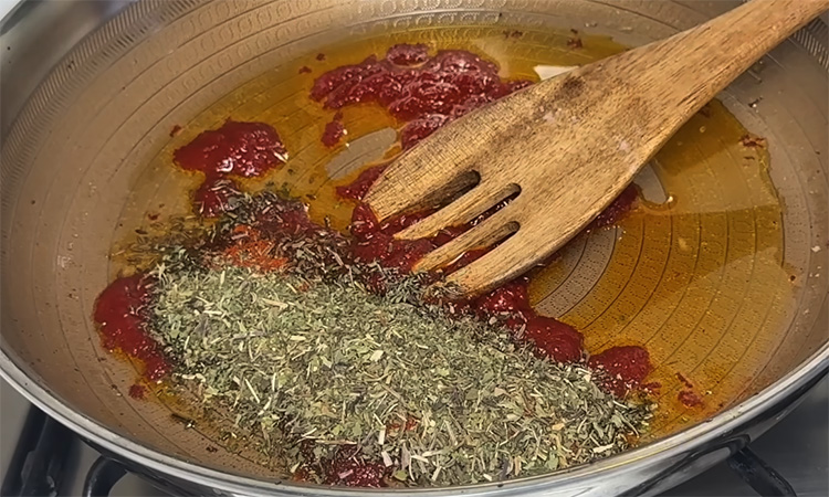 Добавьте чайную ложку зиры, чайную ложку сладкой паприки и столовую ложку сушеной мяты. Перемешайте, дайте специям раскрыться в масле. Через несколько секунд влейте в сковороду один стакан горячей воды, перемешайте и доведите до кипения.