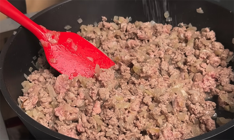 Молоко подогрейте до комнатной температуры. В отдельной миске смешайте яйца, сахар и соль, взбейте венчиком до однородности. Влейте треть молока, снова перемешайте. Всыпьте муку с разрыхлителем, замешайте густое тесто, чтобы комочки разошлись, затем постепенно подливайте оставшееся молоко и доведите консистенцию до жидкой, гладкой. В самом конце влейте растительное масло и перемешайте. Оставьте тесто при комнатной температуре на двадцать минут, чтобы мука полностью набухла. Пока тесто отдыхает, приготовьте мясную начинку. Лук мелко нарежьте и обжарьте на растительном масле до лёгкого золотистого цвета.