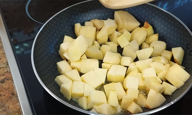 Для начинки очистите яблоки, нарежьте средним кубиком и сразу выложите на разогретую сковороду с растопленным сливочным маслом. Обжаривайте на среднем огне, время от времени перемешивая. Когда начнут румяниться, добавьте немного лимонной кислоты, сахар и корицу. Растворите крахмал в холодной воде и влейте к яблокам, быстро перемешайте, снимите с огня. Начинка должна остыть. Разогрейте духовку до 180 градусов.