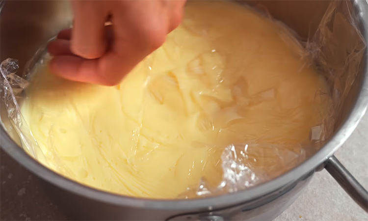 Подготовьте форму диаметром около 20 сантиметров, застелите дно пергаментом, а стенки смажьте маслом и присыпьте мукой. Выложите тесто, разровняйте поверхность и по центру аккуратно разместите теплый заварной крем, формируя углубление, как жерло вулкана.