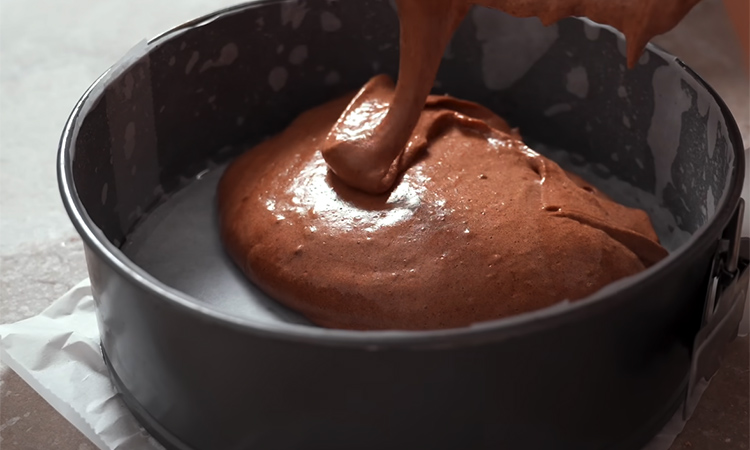 Взбейте массу до густоты и пышности, чтобы след от венчика держался хотя бы секунду. Влейте растительное масло без запаха и аккуратно перемешайте. Просейте муку, какао и при желании добавьте половину чайной ложки разрыхлителя. Введите сухие ингредиенты в три приема, перемешайте лопаткой легкими движениями снизу вверх, чтобы не осадить массу.