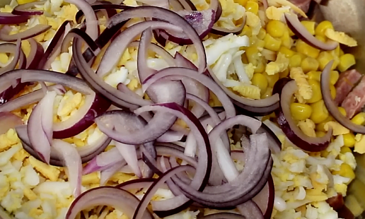 5. Кукурузу из банки слить от жидкости, чтобы салат не был водянистым. Зерна можно слегка промыть под холодной водой. Добавить кукурузу в салатницу к колбасе, сыру и яйцам. В салат добавить майонез и тщательно перемешать все ингредиенты. Можно добавить немного соли и свежемолотого перца по вкусу, если колбаса не слишком соленая.