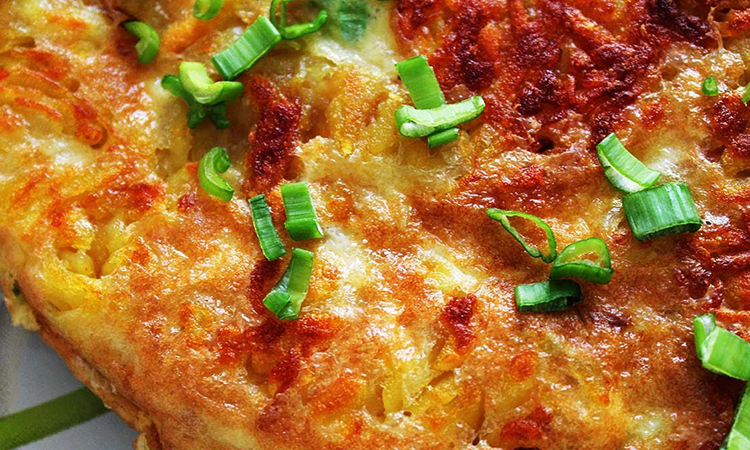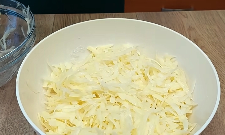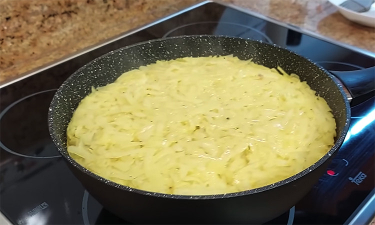 Введите яйца, добавьте соль, перец и немного куркумы, перемешайте так, чтобы смесь стала однородной и впитала крахмал. Картофель пустит немного сока, и масса станет более пластичной. Разогрейте глубокую скородку диаметром около 26 см, слегка смажьте маслом и убедитесь, что разогрев умеренный, но не высокий, чтобы нижний слой картофеля не схватился.