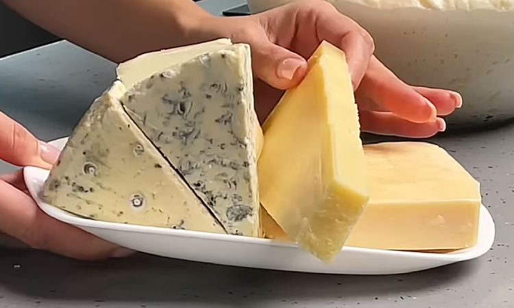 4. Пока тесто подходит, подготовьте начинку. Гауду, пармезан и моцареллу натрите на крупной тёрке — так они будут равномерно распределяться и хорошо плавиться. Сыр с плесенью нарежьте на небольшие кусочки или разломайте руками — его вкус довольно насыщенный, поэтому мелкие фрагменты распределятся по пицце лучше.
